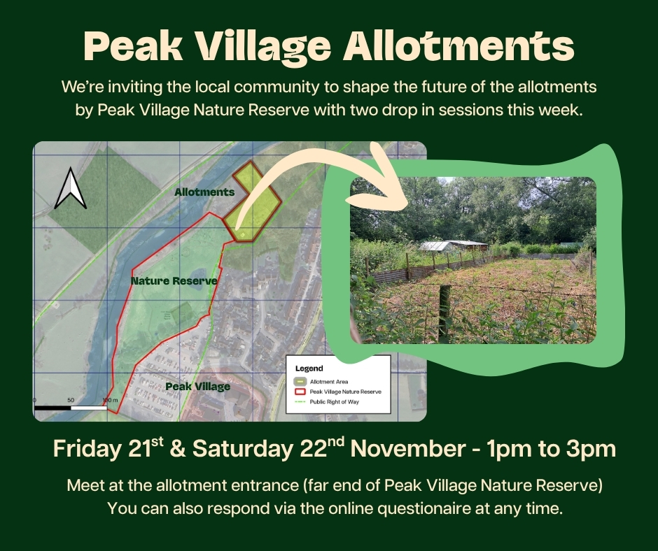 Derbyshire Wildlife Trust are inviting local residents to help shape the future of the local area with a new opportunity to re-invigorate the allotments adjacent to the Peak Shopping Village nature reserve. Many of the plots have been vacant for some time and there is a real appetite to see new life injected into this space. There are two drop-in sessions this week on Friday 21st and Saturday 22nd November from 1-3pm at the allotments to submit your ideas, or you can submit them at any time online: https://forms.office.com/e/6cyvKCY4px